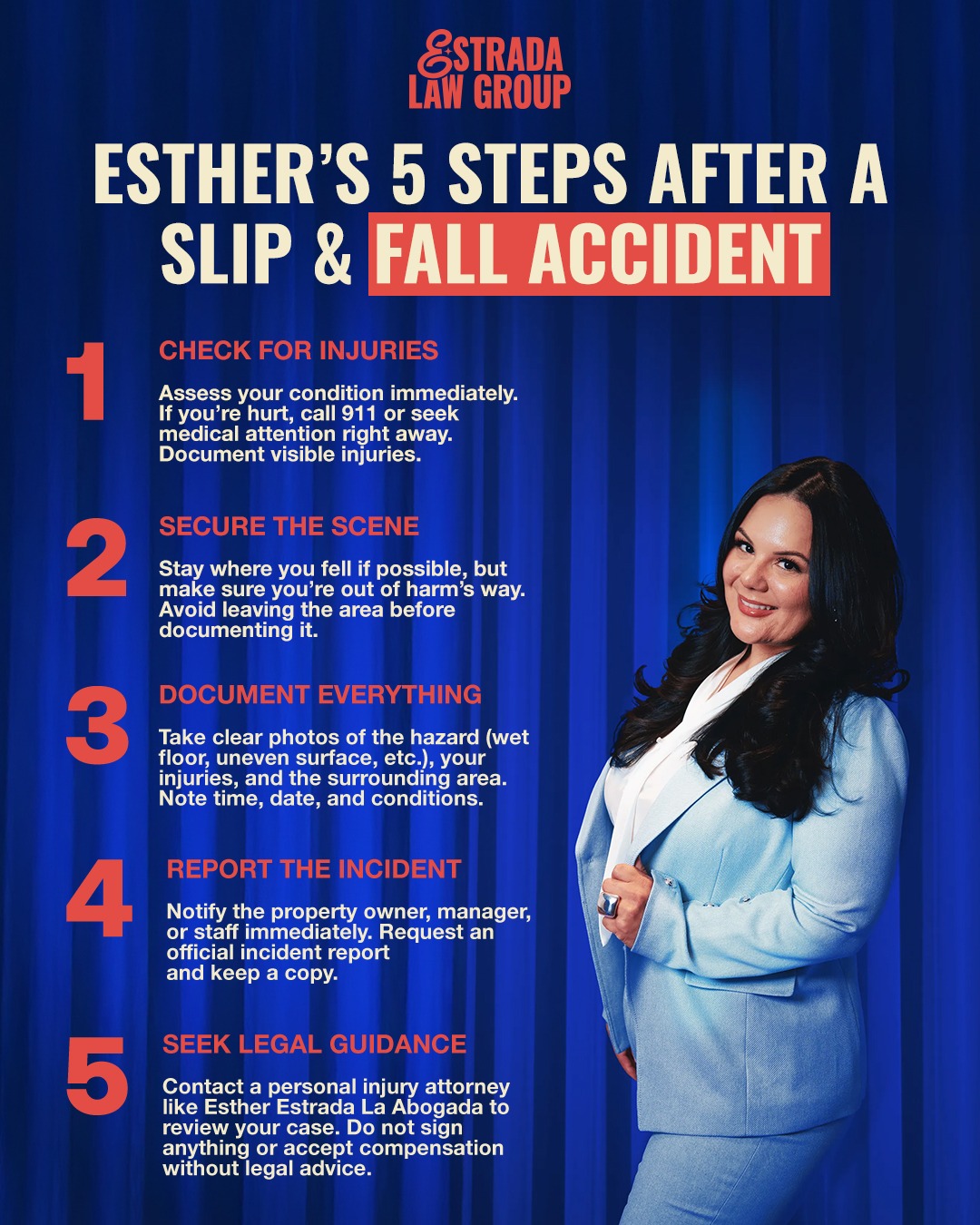That’s why Esther Estrada, La Abogada, breaks it down into five clear steps. These steps are simple, practical, and designed to protect both your health and your legal rights.